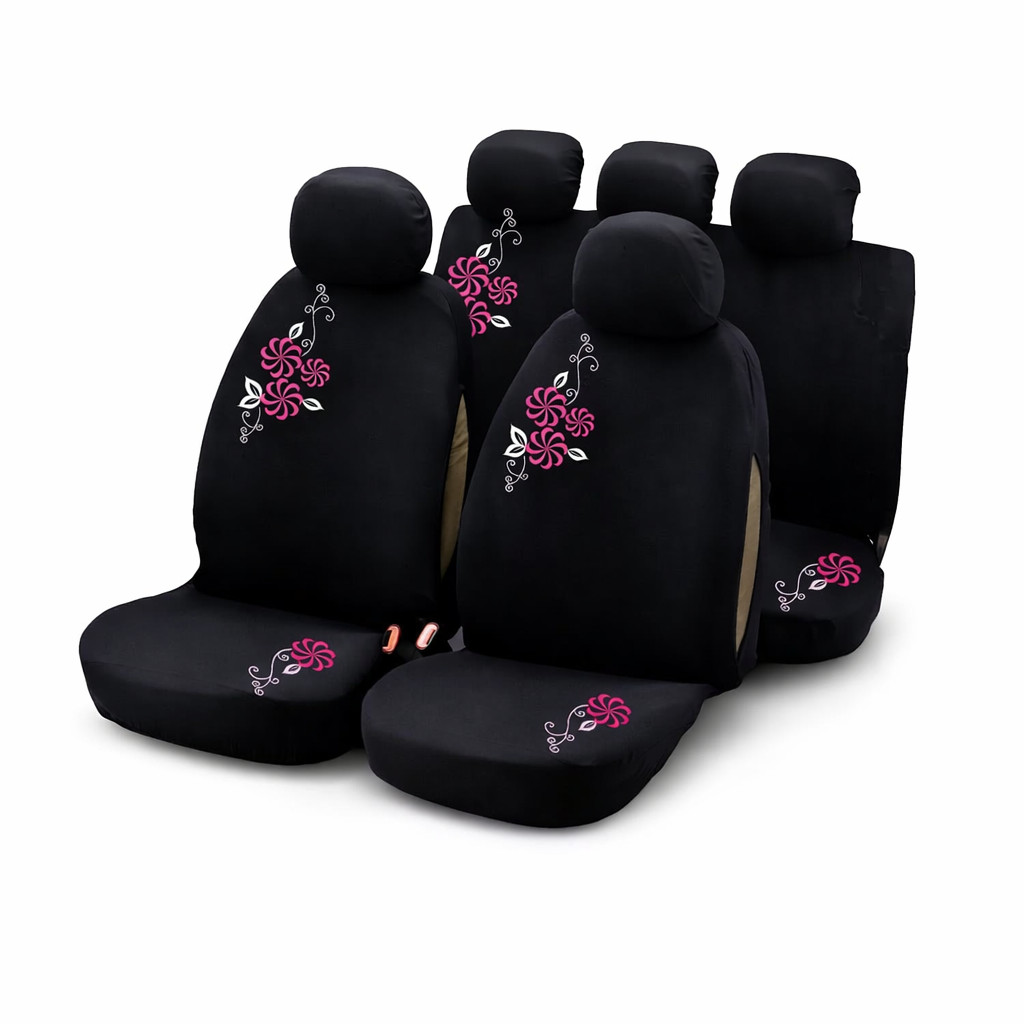 Elegáns design: A fekete alapszínt ízléses, hímzett virágminta díszíti, amely modern és nőies megjelenést kölcsönöz az autó belső terének.
