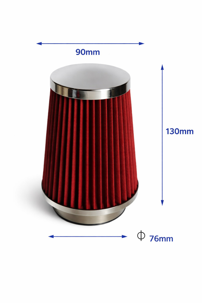 Piros színben(Kis méretű, 1500 cm3-ig)Méretei:- Szélesség: 120mm- Magasság: 155mm- Torok átmérő: 75mmHasználati utasítás:Első üzembe helyezés előtt is be kell olajozni a szűrőt, a tisztítószettben lévő ásványi olajjal. 1. Előtisztítás: tisztítsa meg a légszűrőt egy puha kefével. 2. Permetezze be a szűrőt a tisztítófolyadékkal és hagyja 10 percet hatni. 3. Szárítás: nagy nyomású levegővel (pl. ventilátor) fújja ki a tisztítófolyadékot és a szennyeződéseket a szűrőből. Tilos a hajszárító használata, mert a szűrőt károsíthatja. 4. Olajozás: minden egyes tisztítás után olajozza be a szűrőt. A lépeseket 8-10 ezer km-ként ismételje, hogy pormentes levegőt biztosítson a motor számára. Ha poros úton közlekedik, akkor ajánlott 4 ezer km-kénti ellenőrzés, szükség esetén tisztítás. Figyelmeztetés! A sport levegőszűrőket off-road és gyorsulási versenyekhez használja. Nem használható repülő, vízi- és ipari járművekben. A gyár nem felel semmilyen kárért, ami helytelen használatból, ill. szakszerűtlen beszerelésből ered. Szaktanácsot az illetékes szakszerviztől vagy a vásárlás helyén kérjen. Kizárólag zártpályás sportrendezvénykere. Közúti forgalomban nem használható!
