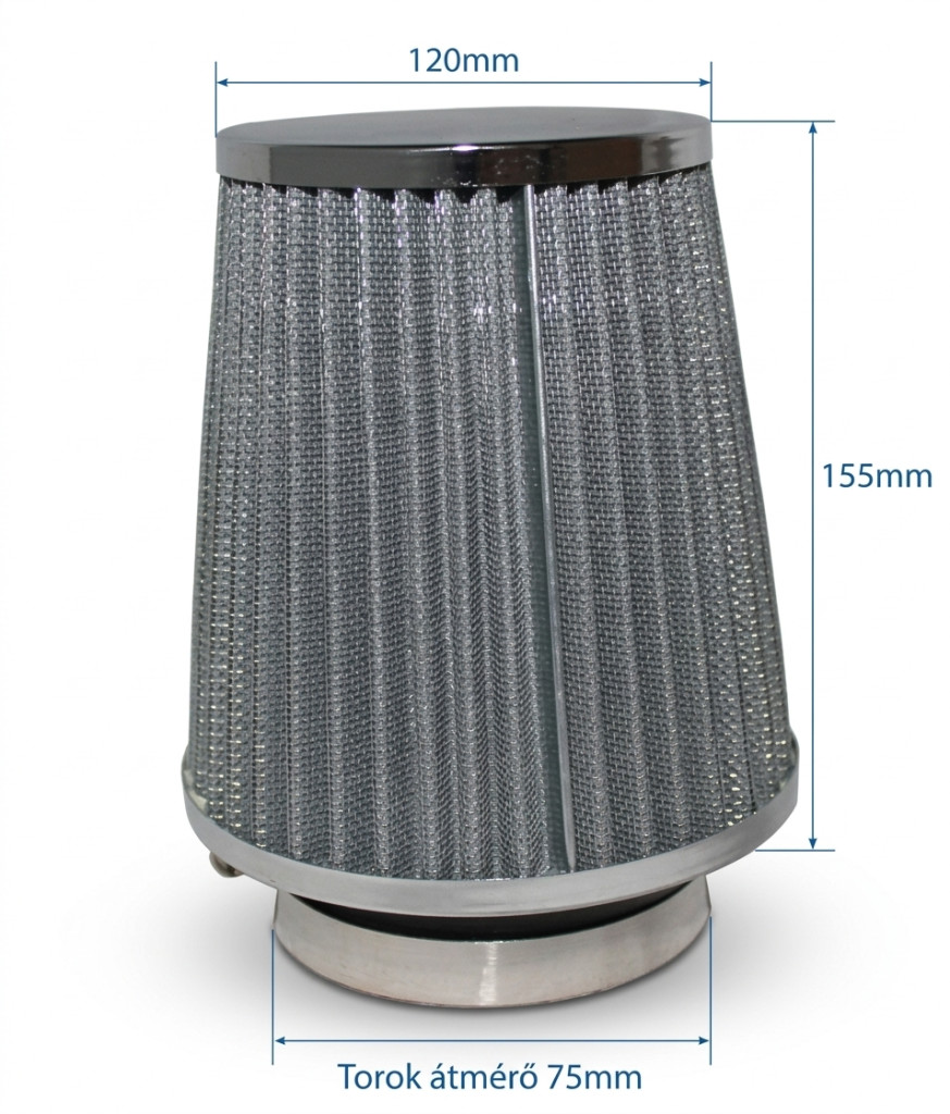 Karbon színben(Kis méretű, 1500 cm3-ig)Méretei:- Szélesség: 120mm- Magasság: 155mm- Torok átmérő: 75mmHasználati utasítás:Első üzembe helyezés előtt is be kell olajozni a szűrőt, a tisztítószettben lévő ásványi olajjal. 1. Előtisztítás: tisztítsa meg a légszűrőt egy puha kefével. 2. Permetezze be a szűrőt a tisztítófolyadékkal és hagyja 10 percet hatni. 3. Szárítás: nagy nyomású levegővel (pl. ventilátor) fújja ki a tisztítófolyadékot és a szennyeződéseket a szűrőből. Tilos a hajszárító használata, mert a szűrőt károsíthatja. 4. Olajozás: minden egyes tisztítás után olajozza be a szűrőt. A lépeseket 8-10 ezer km-ként ismételje, hogy pormentes levegőt biztosítson a motor számára. Ha poros úton közlekedik, akkor ajánlott 4 ezer km-kénti ellenőrzés, szükség esetén tisztítás. Figyelmeztetés! A sport levegőszűrőket off-road és gyorsulási versenyekhez használja. Nem használható repülő, vízi- és ipari járművekben. A gyár nem felel semmilyen kárért, ami helytelen használatból, ill. szakszerűtlen beszerelésből ered. Szaktanácsot az illetékes szakszerviztől vagy a vásárlás helyén kérjen. Kizárólag zártpályás sportrendezvénykere. Közúti forgalomban nem használható!