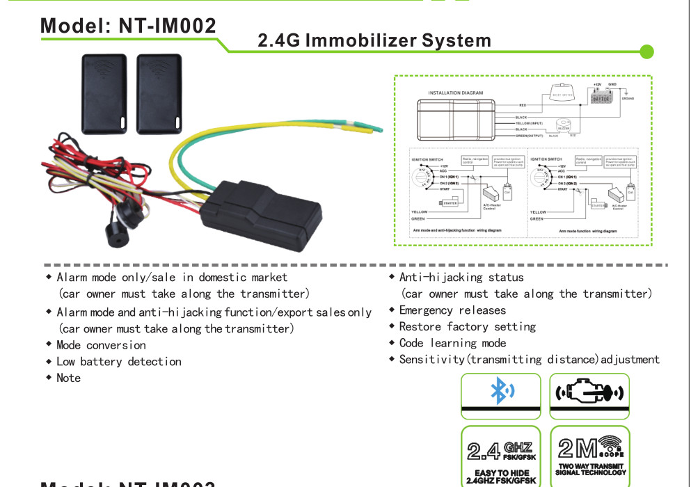 Ez a jármű indításgátló biztonsági rendszer automatikus motorzárral és -feloldással 1–2 méteren belül. Lopásgátló és eltérítés elleni (anti-hijacking) funkcióval rendelkezik (nincs kapcsolatban az ajtók nyitásával vagy zárásával).