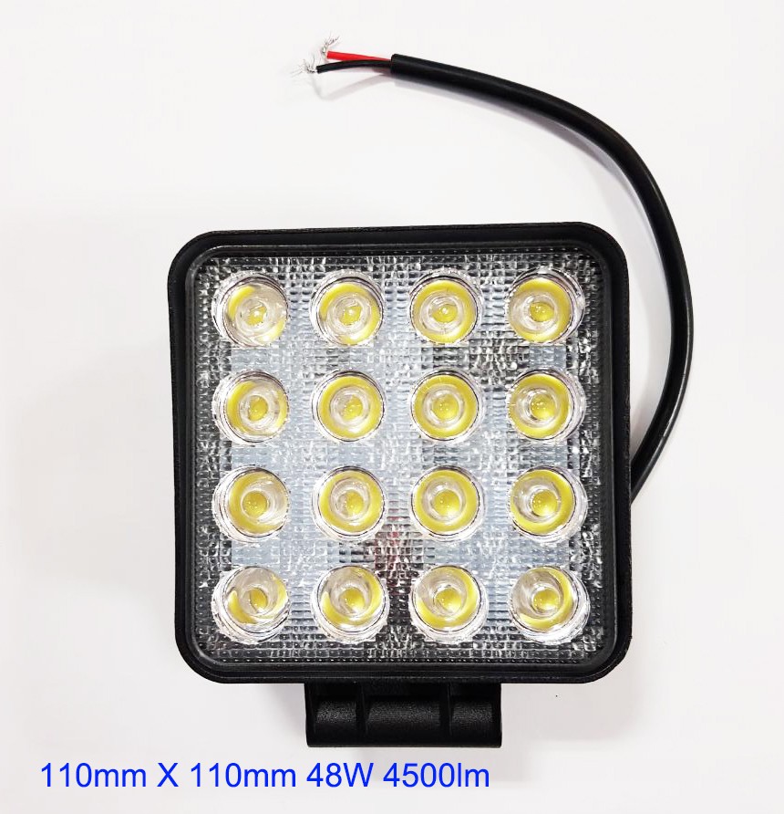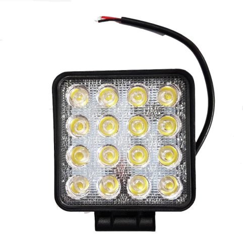 Szögletes munkalámpa 16 LED-es, felrögzítést biztosító szerelvénycsomaggal együtt.FÉNYERŐ: 4500 LUMEN!!!LED Teljesítmény: 22W Üzemi feszültség: 10-30V DC16db * 3w nagy intenzitású Epsitar LED Áramfelvétel 3,4 A - 12V, 1,8A - 24VSzínhőmérséklet: 6000K Anyag: Öntött alumínium házMéret: 110mm * 110mm * 45mmVízálló (IP67) és korróziógátlóFényszórás: 60°