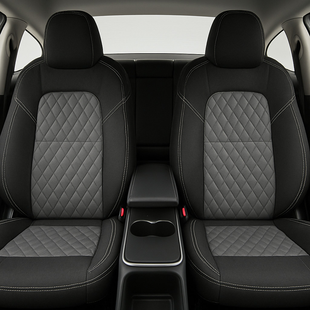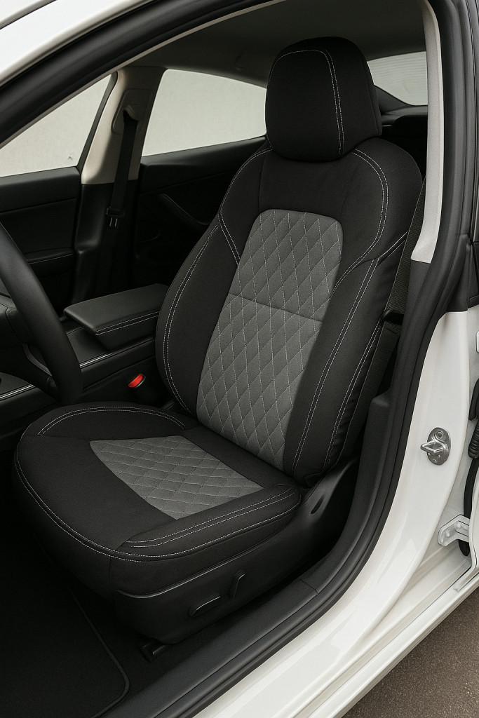 Prémium, fekete–szürke üléshuzat kifejezetten Tesla Model 3 első üléseire tervezve. A huzat középső része puha, steppelt szürke anyagból készül, rombusz mintás varrással, amely nemcsak elegáns megjelenést ad, hanem kényelmesebbé is teszi az ülést hosszabb utakon. A fekete oldalpanelek erős, kopásálló szövetből készülnek, fehér díszvarrással kiemelve a sportos vonalakat.